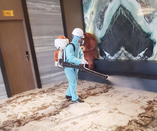 Sau khi mặt nền được làm vệ sinh, tiến hành phun xử lý phòng mối bằng dung dịch hoặc dạng bột lên toàn bộ mặt nền.